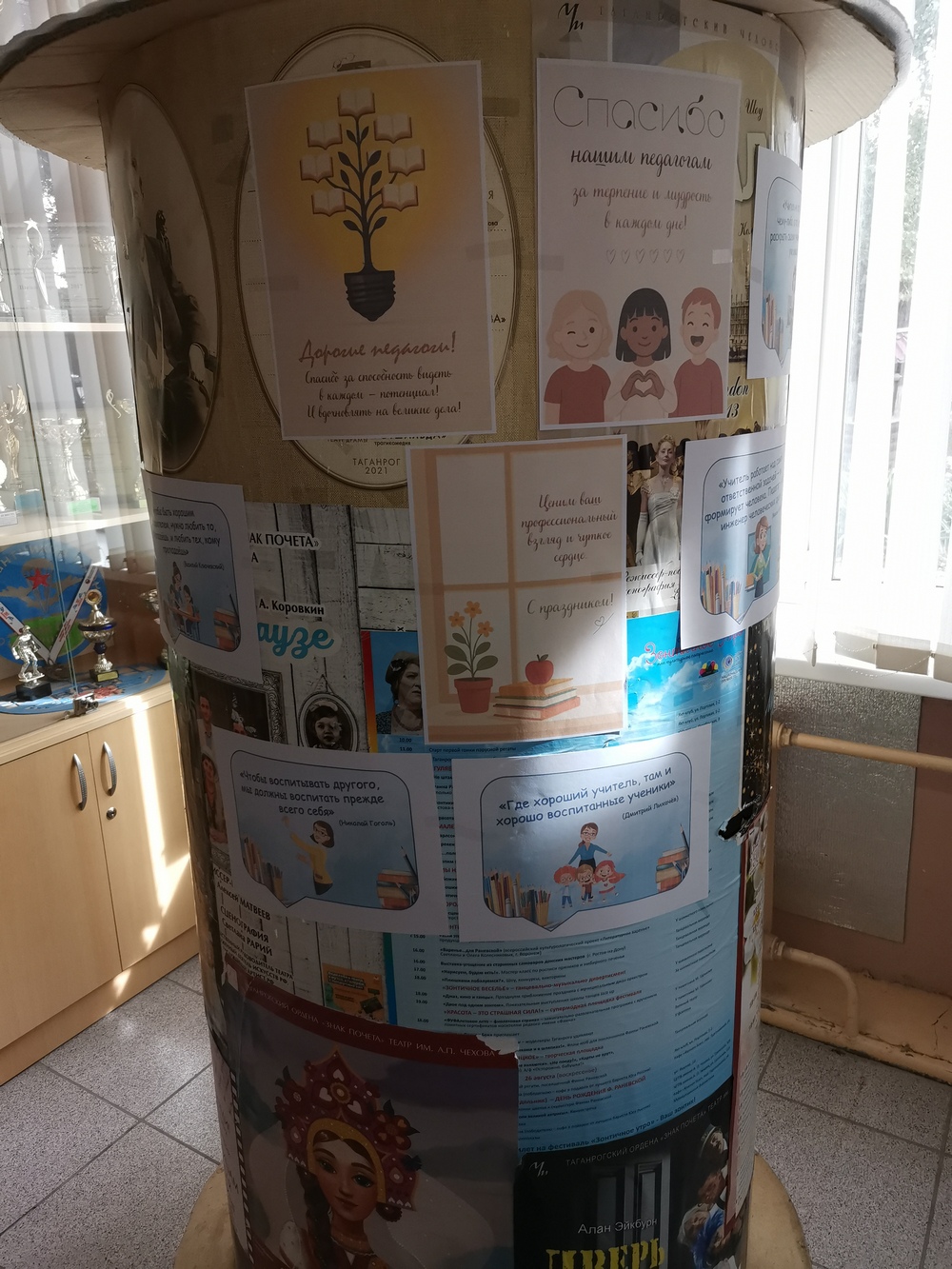 3 октября, в канун Всемирного Дня учителя, в Таганрогском филиале ГКОУ РО «Ростовская-на-Дону санаторная школа-интернат № 74» прошел калейдоскоп творческих дел, посвященных Дню Учителя. Прежде всего, учащиеся 11 класса на несколько уроков стали учителями, что позволило им убедиться, насколько нелёгок труд педагога. Корреспонденты школьной газеты подготовили специальный выпуск газеты «Наша жизнь», а каждый класс, втайне от педагогов, выпустил плакат с поздравлениями для учителей. Совет самоуправления позаботился о том, чтобы на переменах звучала праздничная музыка, были украшены двери классов и фойе, а отряды приготовили разнообразн6ые букеты с тематическими названиями. Завершением этого праздничного дня стала театрализованная программа «С любовью к учителям», в которой приняли участие все классы. Ребята подготовили стихи, сценки, песни, телепередачу и фильм о педагогах нашей школы. Выпускники разных лет прислали видео поздравления учителям, воспитателям и педагогам дополнительного образования, что особенно их тронуло. Праздничный день получился ярким, насыщенным и запоминающимся.