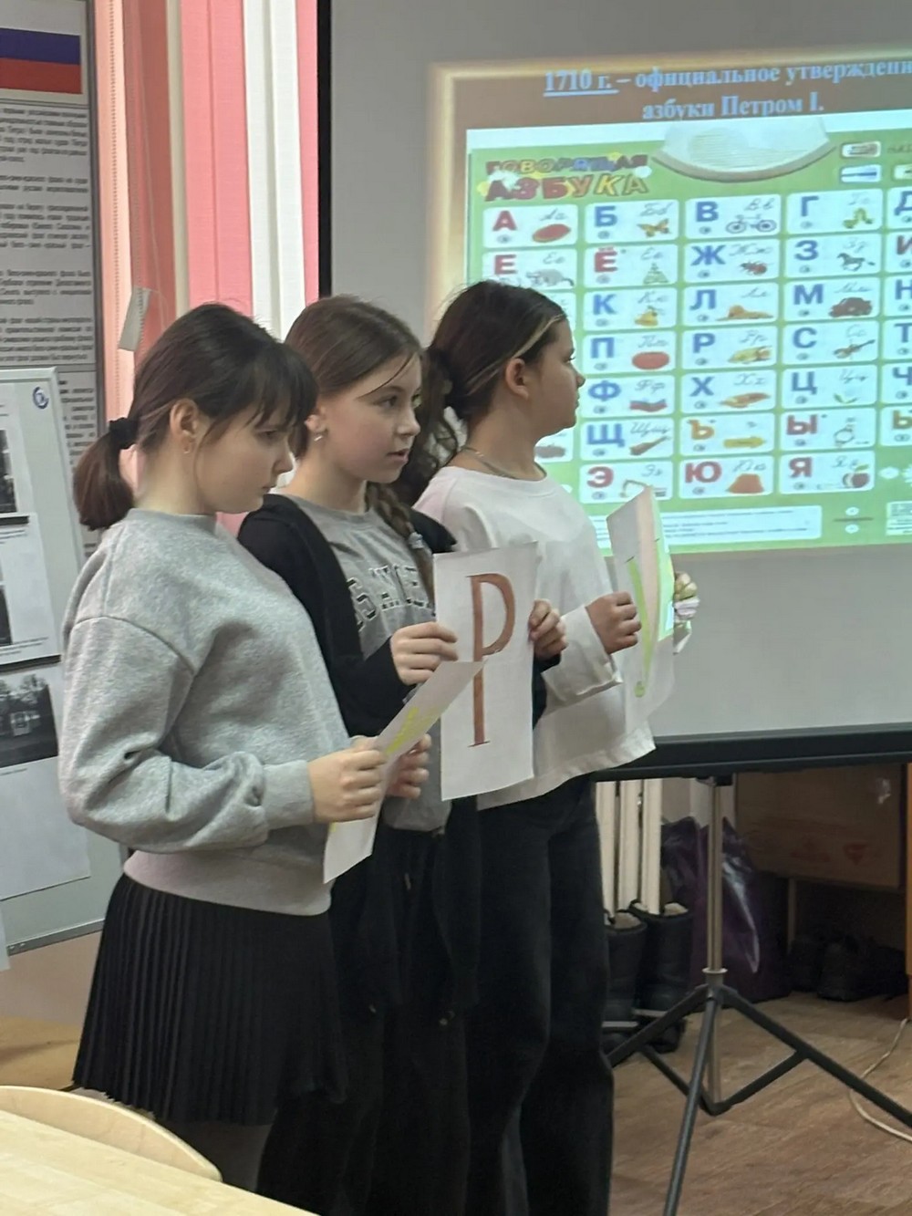 Для проведения викторины ребята разделились на 2 команды:ˆкоманду девочек под названием «Алфавит» и команду мальчиков «Азбука». Названия своих команд ребята составили из предложенных букв. Основным заданиям викторины предшествовала разминка капитанов команд. Во время разминки ребята отгадывали слова, в состав которых входили буквы, похожие на местоимения. Затем помощники рассказали ребятам о создании русского алфавита, деятельности Кирилла и Мефодия, а также о различных изменениях, которые с течением времени происходили в русском языке. Потом ребята с удовольствием вспомнили пословицы и поговорки о силе знаний, правильное произношение всех букв русского алфавита, продемонстрировали иллюстрации к учебнику русского языка. Ярким завершением викторины стала сказка о буквах, которые в конце соединились в слово «ДРУЖБА». Со счетом 16 баллов в викторине победила команда девочек «Алфавит». Все участники мероприятия с удовольствием сделали фото на память.