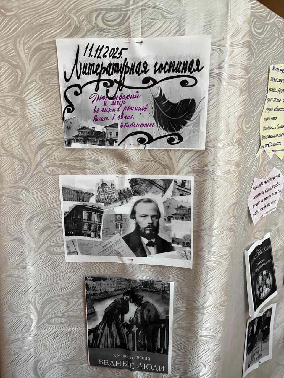 В канун дня рождения Ф.М. Достоевского библиотекарь Дудка С.Ю. совместно с активом школьной библиотеки оформили выставку книг великого русского писателя. На выставке были размещены книги автора, с которыми можно познакомиться в школьной библиотеке. В оформлении были использовать также элементы осенних мотивов 11 ноября ребята пригласили всех желающих принять участие в литературной гостиной «Достоевский и мир великих романов», которая пройдет в уютном читальном зале школьной библиотеки.